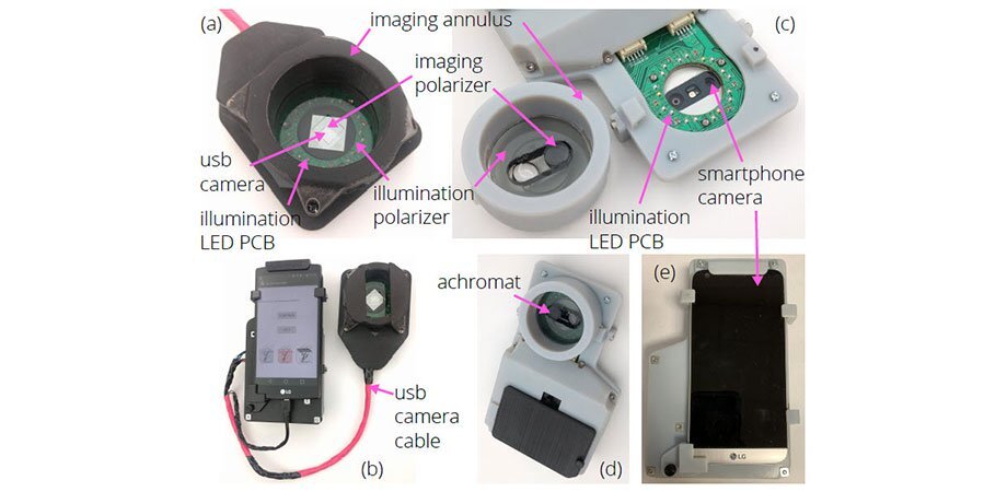 Повреждения кожи диагностируются по простой системе цвета, размера, асимметрии и внешнего вида поверхности. Способ освещения очагов указывает на различия между нормальными и злокачественными поражениями. Для своего исследования авторы разработали два дерматоскопа с использованием камеры на базе смартфона и камеры на основе USB. Оба дерматоскопа, объединяющие поляризованную визуализацию белого света на основе светодиодов (PWLI), поляризованную многоспектральную визуализацию (PMSI) и алгоритмы обработки изображений, успешно сопоставлены и разграничены между дермальными хромофорами, указывающими на меланому и эритему. Таким образом, новый дерматоскоп поможет отличить злокачественное образование от безобидного покраснения кожи.