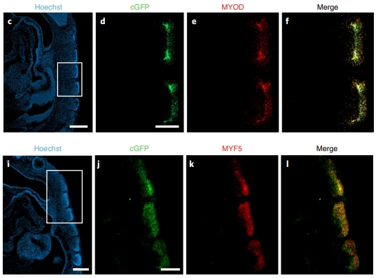 Человеческие клетки в качестве будущих мышц в зародыше свиньи: они светятся зеленым и экспрессируют мышечные маркеры