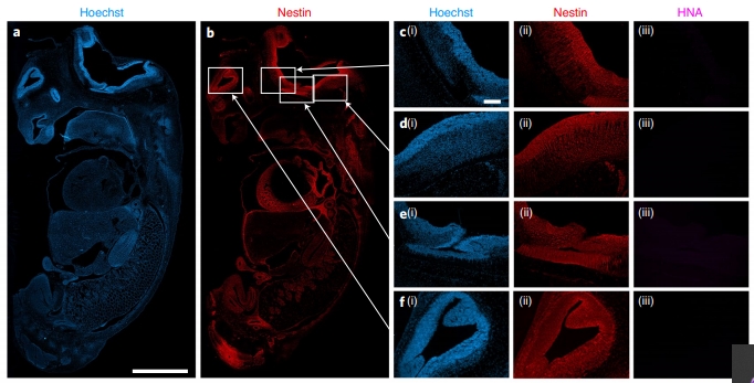 Нервная ткань в зародыше свиньи (красный) не содержит в себе клеток человека (фиолетовый)
