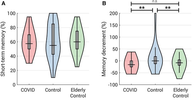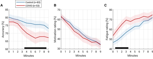 В начале теста между экспериментальной и контрольной группами не было большой разницы в количестве правильных ответов, но у переболевших ковидом было замедлено время реакции. К концу теста количество правильных ответов у переболевших значительно снизилось (что говорит о постепенном снижении внимания). Так у людей не болевших ковидом количество правильно решенных заданий от третьей к девятой минуте теста снижалось с 78,5 процента до 75,4 процента, а у перенесших ковид правильность выполнения теста со временем страдала сильнее и снижалась с 75,5 процента до 67,8 процента (p = 0,008). Кроме этого, у людей, перенесших ковид, результаты теста на долгосрочную память были в среднем на 9 процентов хуже, чем у контрольной группы, хотя краткосрочная память у обеих групп не отличалась.