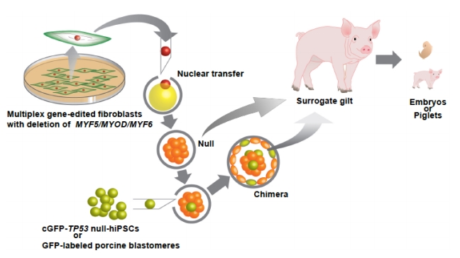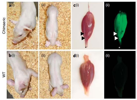 Затем авторы работы проверили, можно ли «спасти» модифицированных свиней с помощью комплементации бластоцисты. Для этого в каждый такой зародыш на четвертый день развития добавили по одной клетке обычной свиньи со встроенным геном зеленого флуоресцентного белка. Потом эти химерные зародыши подсадили в матку свиней, и на свет появились химерные животные. Их мышцы были полностью донорскими (флуоресцировали зеленым), но поросята-химеры передвигались и вели себя точно так же, как и обычные животные.