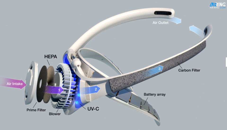 Компания Biotlab представила носимое устройство Air-Ring с магнитными защитными экранами для лица и персональным запасом отфильтрованного и стерилизованного УФ-излучением воздуха.