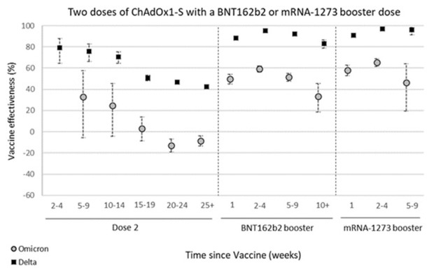Люди, вакцинированные AstraZeneca, которые получили дополнительную дозу мРНК-вакцин были защищены от ковида на 60 процентов спустя 2-4 недели после инъекции, а через десять недель эффективность вакцинации упала до 35 процентов (доза Pfizer) и до 45 процентов (доза Moderna).